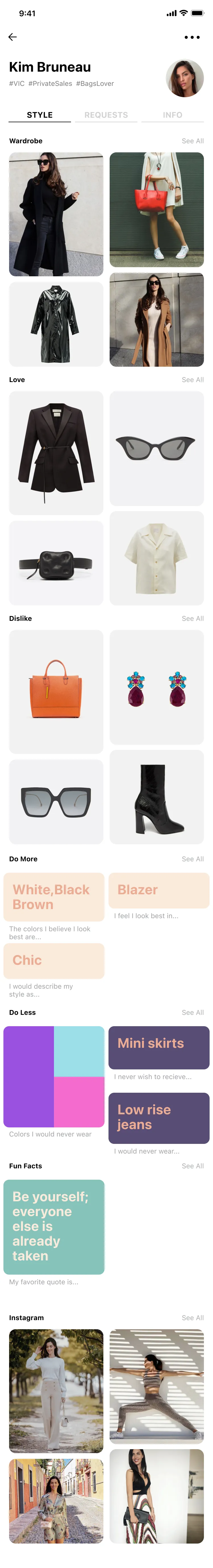 The rich client profile brings a fully immersive view of your client. Tap on their wardrobe, love or dislikes, and simply flick though all their favorite, and less favorite, products and looks.